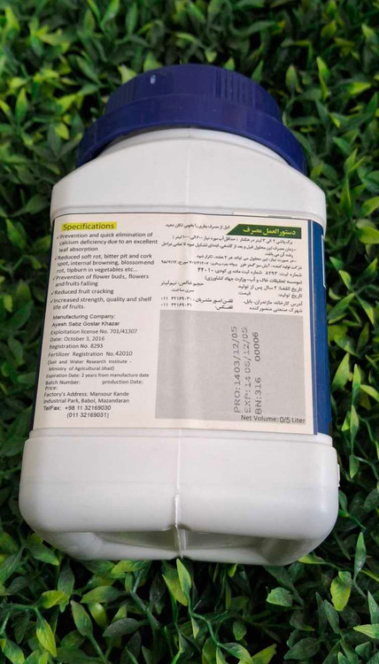 • سایر توضیحات:مزایا: پیشگیری و رفع سریع کمبود کلسیم بدلیل جذب برگی بسیار عالی- کاهش پوسیدگی نرم، لکه تلخی و چوب پنبه ای، قهوه ای شدن درونی، پوسیدگی گلگاه و سوختگی نوک برگ های سبزیجات و غیره - جلوگیری از ریزش جوانه های گل، گلها و میوه کاهش ترک خوردگی در میوه ها -افزایش استحکام، کیفیت و عمر مفید میوه