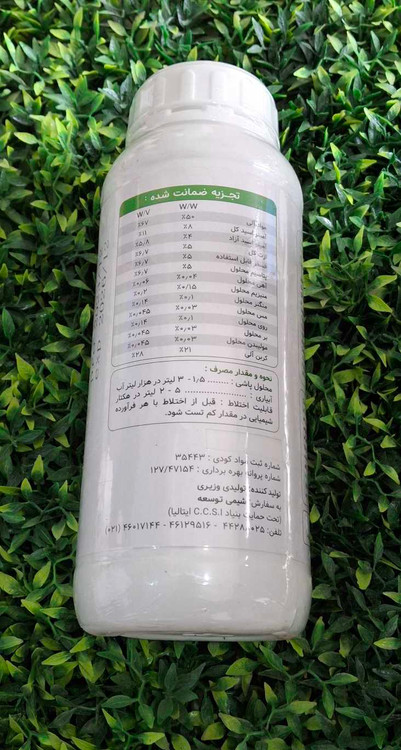 محلول پاشیآبیاری1.5تا 3 لیتر در هزار لیتر آب2-5لیتر در هکتار