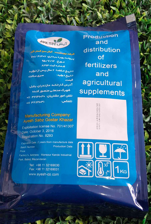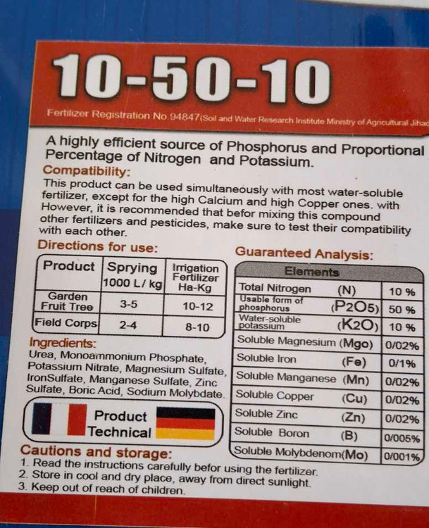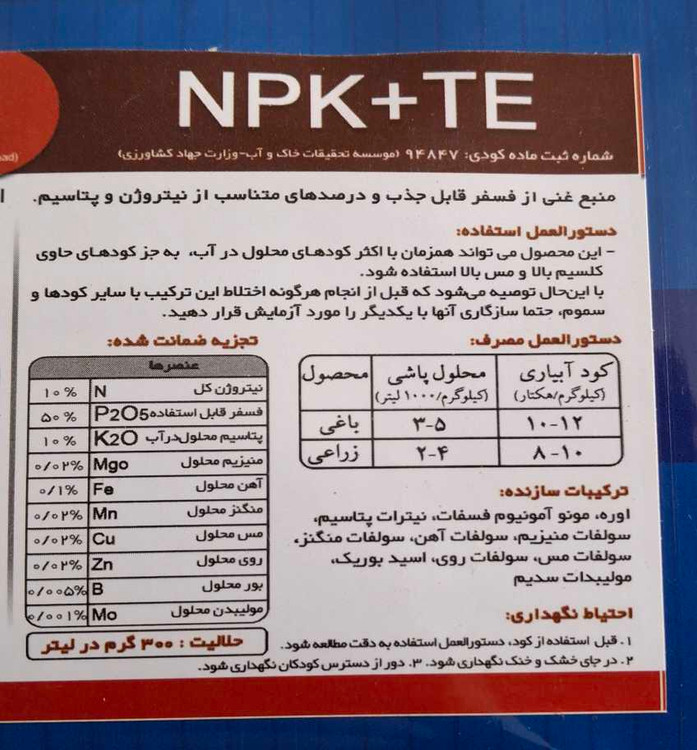 کود آبیاری (کیلوگرم/هکتار)محلول پاشی (کیلوگرم / 1000 لیتر)محصول10-122-5باغی8-122-4زراعی