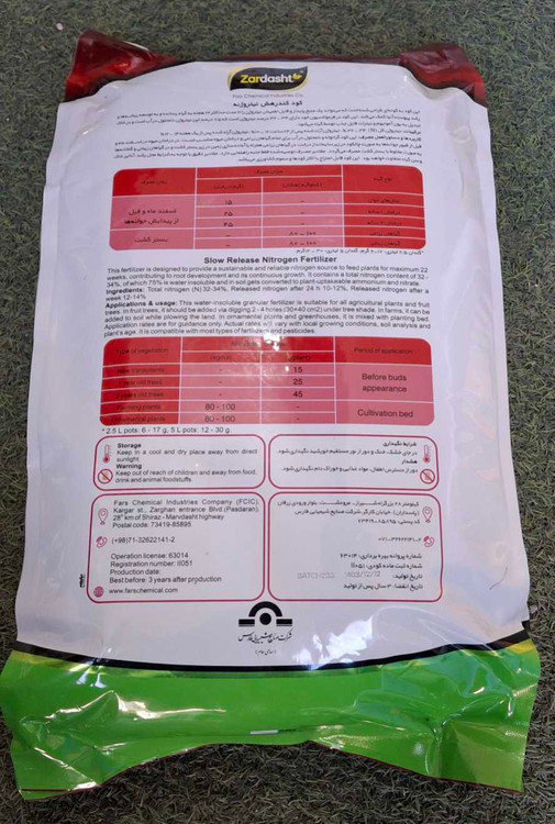 کود کندرهش نیتروژنهSRF به گونه ای طراحی شده است که میتواند يک منبع پايدار و قابل اطمينان نيتروژن را تا مدت حداکثر 22 هفته به گياه رسانده و به توسعه ريشهها و رشد پیوسته آنها کمک میکند. اين کود در فرمولاسيون خود دارای 34 – 32 درصد نيتروژن است که 75 درصد اين نيتروژن نامحلول در آب است و در خاک تبديل به یون آمونيوم و نيترات قابل جذب توسط گیاه میشود.
