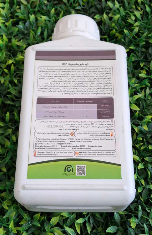 کود مایع k60 با داشتن درصد بالایی از پتاسیم محلول برای تامین و رفع سریع کمبود پتاسیم گیاه طراحی شده است .اسیدی بودن این کود و وجود اسید آمینه قابلیت جذب پتاسیم را به نحو قابل ملاحظه ای افزایش می دهد. بعلاوه این کود سبب همرسی و یک نواختی میوه ها بهبود رنگ و بازارپسندی محصول افزایش قند (بریکس میوه ) و مقاومت بیشتر در برابر تنشها می شود. استفاده از این کود پتاسیمی بصورت محلول پاشی توصیه میشود.