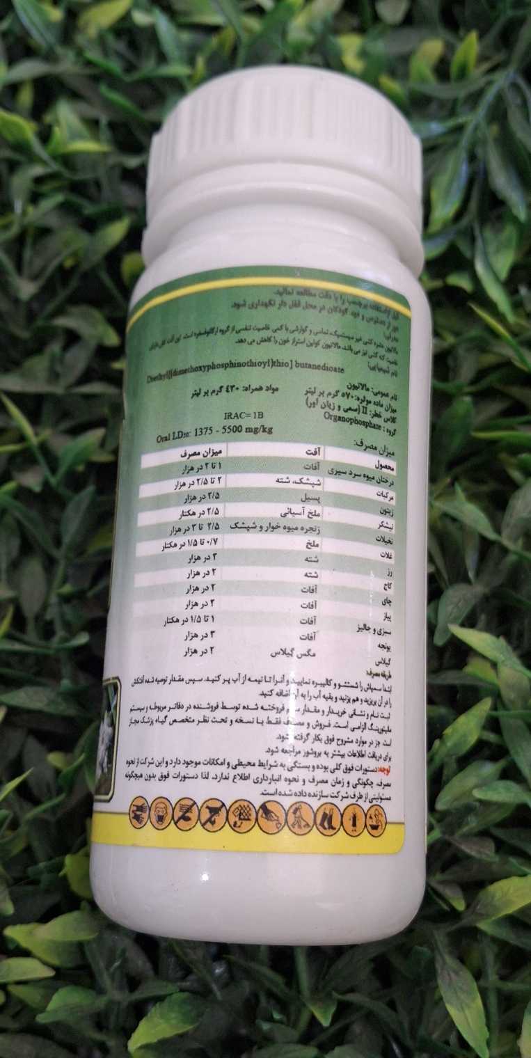 حشره کش مالاتیون از دسته ی فسفر آلی با ویژگی تماسی، گوارشی، تدخینی و غیر سیستمیک است که گستره ی بسیار زیادی از حشره کشی است. ترکیب این حشره کش برای مبارزه با آفات غلات، درختان میوه سردسیری، زنجیره میوه خوار، شپشک خرما، مگس چغندر، مگس گیلاس، آفات سبزی جات، صیفی جات و جالیز، شپشک و شته مرکبات، پسیل زیتون، آفات یونجه، ملخ آسیایی نیشکر، شته رز و کاج از آن استفاده شود.